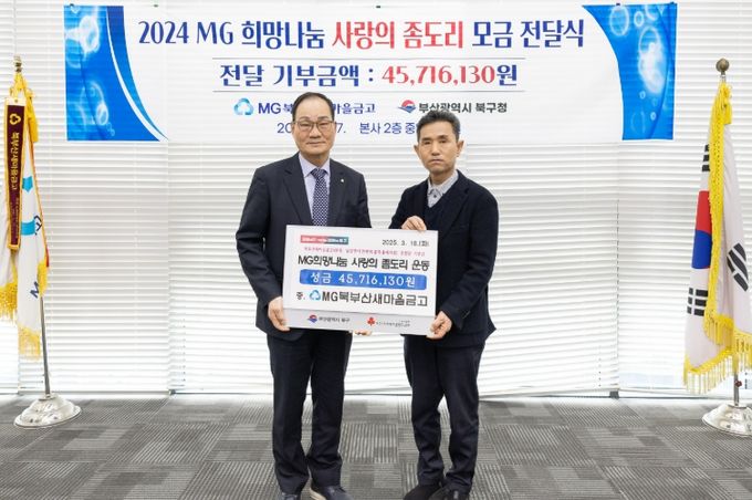 북부산새마을금고는 지난해 9월부터 4개월 동안 ‘사랑의 좀도리 운동’을 통해 약 4천5백만 원의 후원금을 모금했으며, 이날 북부산새마을금고 본점에서 성금 전달식을 개최했다.