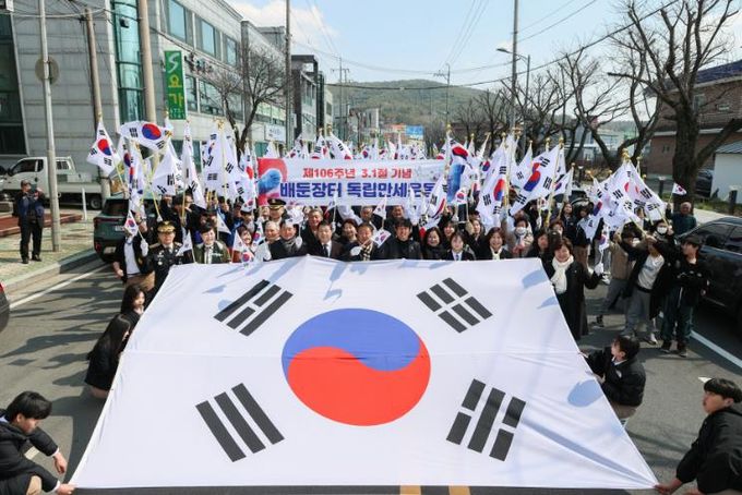 이후 행사 참가자들은 창의탑을 출발해 회화면 배둔시장을 지나는 길을 함께 행진하며 106년 전 배둔장터에 울려 퍼진 대한독립 만세운동을 재현해냈다.