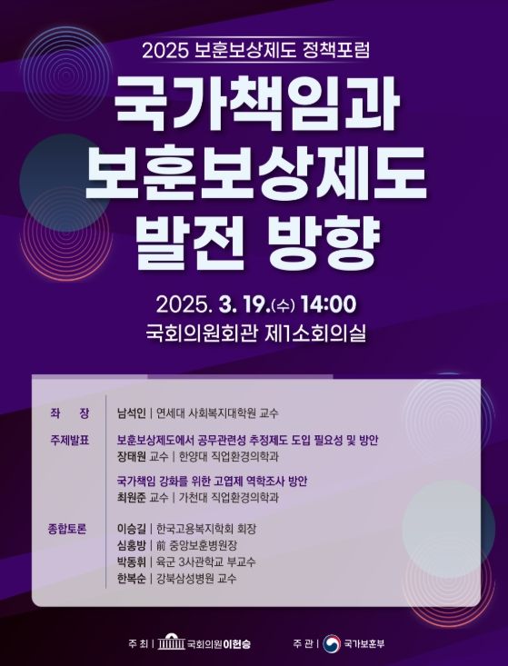 이번 포럼은 국가를 위한 희생과 헌신에 대한 국가의 책임을 강화하고, 보훈보상제도의 발전 방향을 모색하기 위해 마련됐으며, 국회·정부·학계·보훈단체 관계자 등 약 100여 명이 참석할 예정이다.
