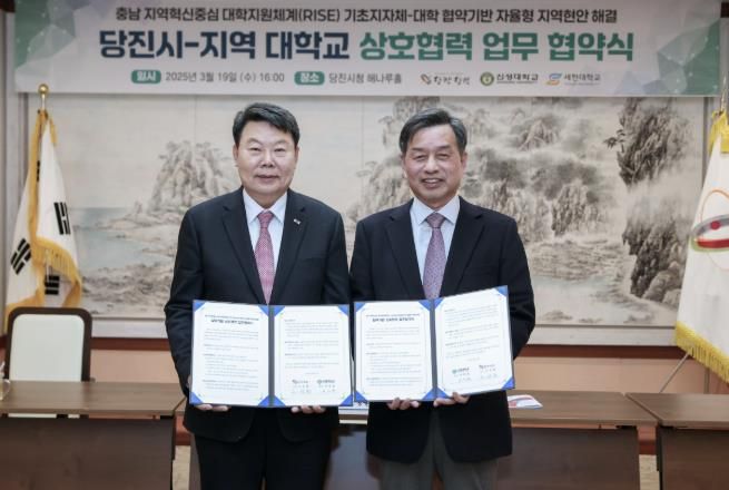 (아름다운교육신문) 당진시는 19일 당진시청 내 해나루홀에서 신성대학교 및 세한대학교와 지역 현안 해결 추진을 위한 ‘지역혁신중심 대학지원체계(RISE)' 업무협약식을 진행했다고 20일 밝혔다.