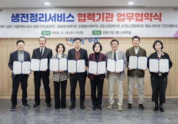 이번 협약에는 강동구를 비롯하여 서울주택도시공사 강동주거안심종합센터(센터장 김종권), 구립강동종합사회복지관(관장 임정백), 구립성내종합사회복지관(관장 이상현), 시립강동노인종합복지관(관장 성미선), 성가정노인종합복지관(관장 최은영), 구립해공노인복지관(관장 홍원표), 사회적 협동조합 멋진인생웰다잉(대표 김태근) 등 총 8개 기관이 참석해 생전정리서비스 사업 전반에서 협력하기로 했다.