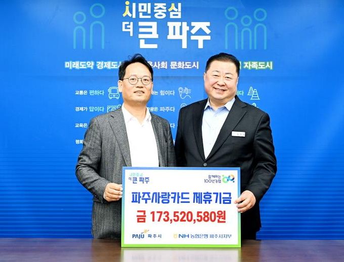 (아름다운교육신문) 파주시는 지난 19일 엔에이치(NH)농협은행 파주시지부로부터 지난해 적립된 제휴카드 적립기금 1억 7,352만 580원을 전달받았다고 밝혔다.