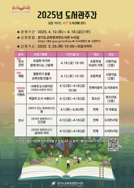 왕태환 경기도교육청과천도서관장은 “도서관 주간을 맞아 지역 주민과 학생들을 위해 다채로운 행사를 마련했다”면서 “꽃피는 계절 도서관에서 행복한 추억을 남기며 도서관 이용의 즐거움을 느끼는 시간이 되시길 바란다”고 말했다.