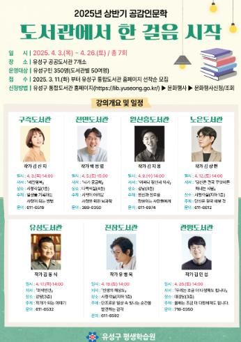 20일 유성구에 따르면 4월 도서관의 날, 도서관 주간 등을 맞아 7개 공공도서관에서 ‘도서관에서 한 걸음 시작’을 주제로 2025년 상반기 공감인문학 강연을 운영한다.