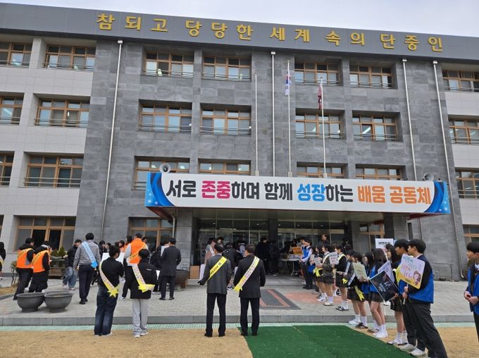 (아름다운교육신문) 충청북도단양교육지원청은 3월 20일 오전 8시 단양중학교에서 생명존중 및 자살 예방을 위한 등굣길 캠페인을 실시했다.