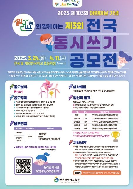 (아름다운교육신문) 인천광역시교육청은 전국 초등학생과 재외 한국학교 학생들을 대상으로 ‘제3회 전국 동시 쓰기 공모전’을 개최한다고 밝혔다.