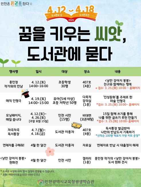 (아름다운교육신문) 인천광역시교육청평생학습관과 인천광역시교육청북구도서관은 4월 도서관의 날과 도서관 주간을 맞아 ‘꿈을 키우는 씨앗, 도서관에 묻다’라는 공동 주제로 다채로운 독서 문화 행사를 개최한다.