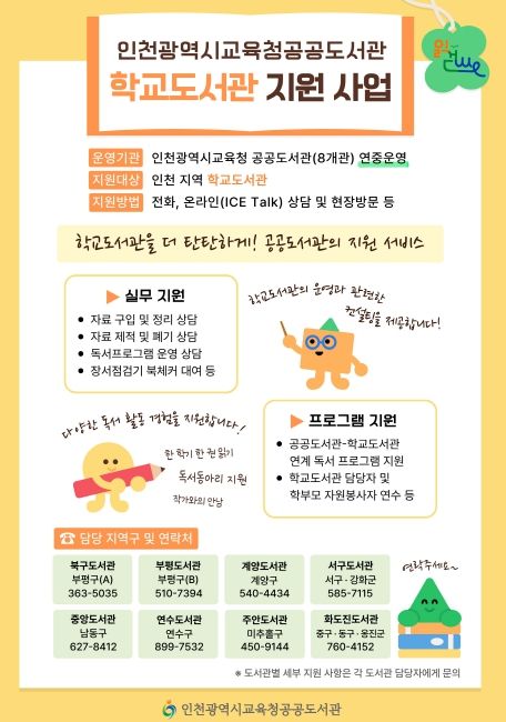 (아름다운교육신문) 인천광역시교육청은 인천시교육청 산하 8개 공공도서관에서 학교 도서관 운영 지원 및 독서교육 활성화를 위한 ‘학교도서관 지원 사업’을 운영한다.