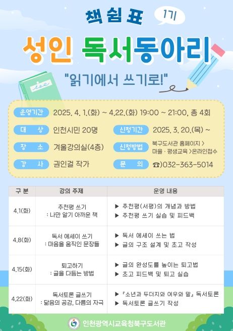 (아름다운교육신문) 인천광역시교육청북구도서관은 ‘읽걷쓰’사업의 일환으로 시민 독서 활동 지원을 위한 성인 독서 동아리 ‘책쉼표’ 참여자를 모집한다.