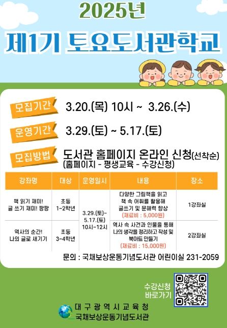 (아름다운교육신문) 국채보상운동기념도서관은 3월 20일부터 26일까지 도서관 누리집을 통해‘제1기 토요도서관학교’참가자를 모집한다.