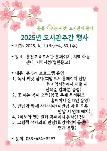 (아름다운교육신문) 홍천교육도서관은 4월 1일부터 30일까지 홍천지역아동센터, 지역서점, 홍천교육도서관 누리집에서 지역주민의 독서를 장려하기 위해 제61회 도서관주간 행사를 운영한다. 운영 기간 중 도서관 환경 개선 공사로 인하여 온라인 및 오프라인으로 행사를 진행할 예정이다.
