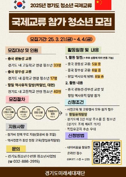 (아름다운교육신문) 경기도와 경기도미래세대재단은 청소년들의 글로벌 역량 강화를 위해 오는 4월 4일까지 ‘2025년 경기도 청소년 국제교류 사업’ 참가자를 모집한다.