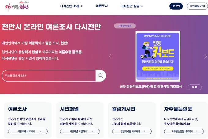 이번 조사는 오는 31일까지 만 14세 이상 천안시민이라면 누구나 참여할 수 있으며, 천안시 온라인 여론 수렴 시스템인 ‘다시 천안’을 통해 PC와 모바일로 간편하게 참여할 수 있다.