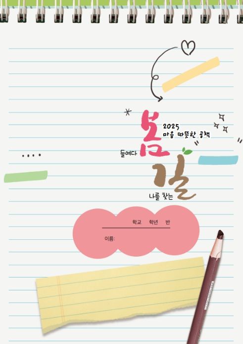 학교 현장의 의견을 반영하여 개선된 자료로 제작된‘2025 마음 따뜻한 공책, 봄 길’은 1부‘들여다 봄’(인성 키움 자료)과 2부‘나를 찾는 길’(인성 도움 자료)로 구성되어 학생 주도적 인성교육 활동을 돕는 역할을 한다.