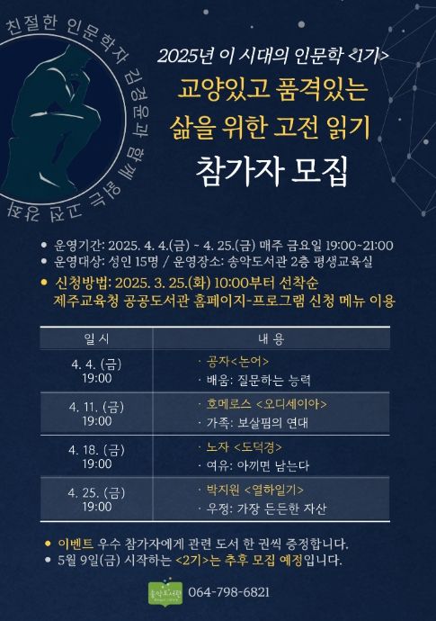 (아름다운교육신문) 제주도교육청 송악도서관은 4월 4일부터 25일까지 성인을 위한 ‘이 시대의 인문학 1기’ 프로그램을 운영한다.