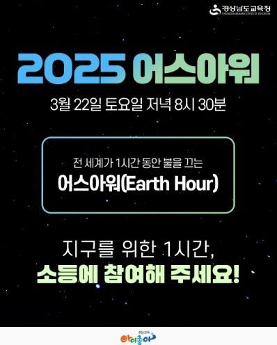 (아름다운교육신문) 경상남도교육청은 생태전환교육을 실천하고자 전 세계가 함께 1시간 동안 불을 끄는 ‘어스아워(Earth Hour)’ 캠페인에 참여한다.