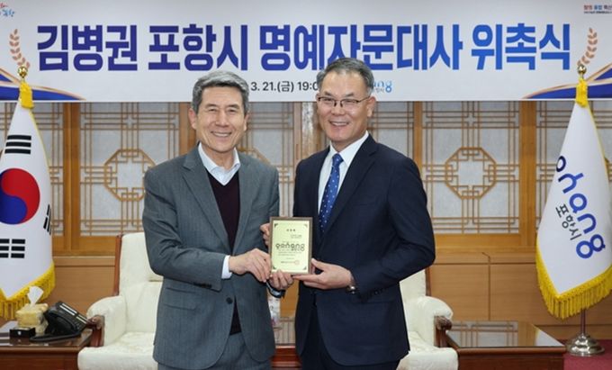 이날 이강덕 시장은 김병권 명예자문대사에게 위촉패를 전달하고, 포항시의 해외 투자유치 및 정책 수립에 전략적 조언 등 지방외교의 가교역할을 해줄 것을 당부했다.