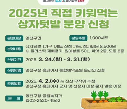 희망자는 오는 24일부터 31일까지 구청 홈페이지 통합예약포털에서 온라인으로 신청하면 된다. 전산 추첨으로 대상자를 선정해 4월 2일 발표하고, 4월 14일부터 신청 시 입력한 주소로 상자텃밭 세트를 배송할 예정이다.