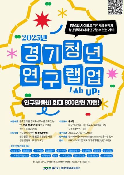 (아름다운교육신문) 경기도와 경기도미래세대재단이 4월 20일까지 ‘2025년 경기청년 연구 랩업(Lab up!)’ 참여팀을 모집한다.