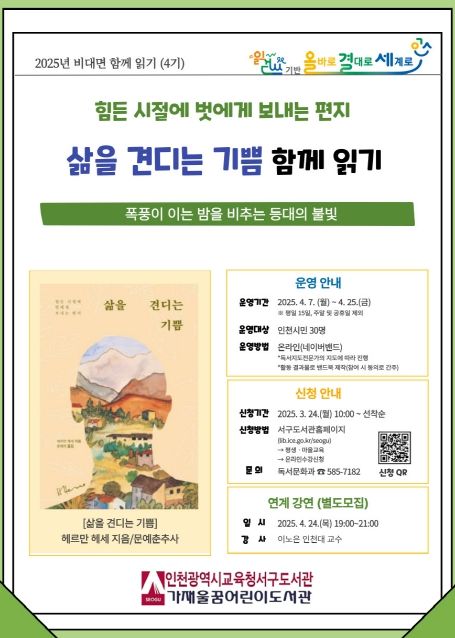 (아름다운교육신문) 인천광역시교육청서구도서관은 4월 7일부터 25일까지 헤르만 헤세의 고전 에세이 ‘삶을 견디는 기쁨’ 함께 읽기 온라인 프로그램을 운영한다.