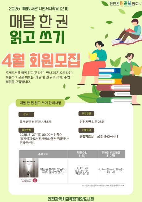 (아름다운교육신문) 인천광역시교육청계양도서관은 인천 시민(성인)을 대상으로 2025년 시민저자학교 ‘매달 한 권 읽고 쓰기’ 프로그램을 4월부터 11월까지 8개월 동안 운영한다.