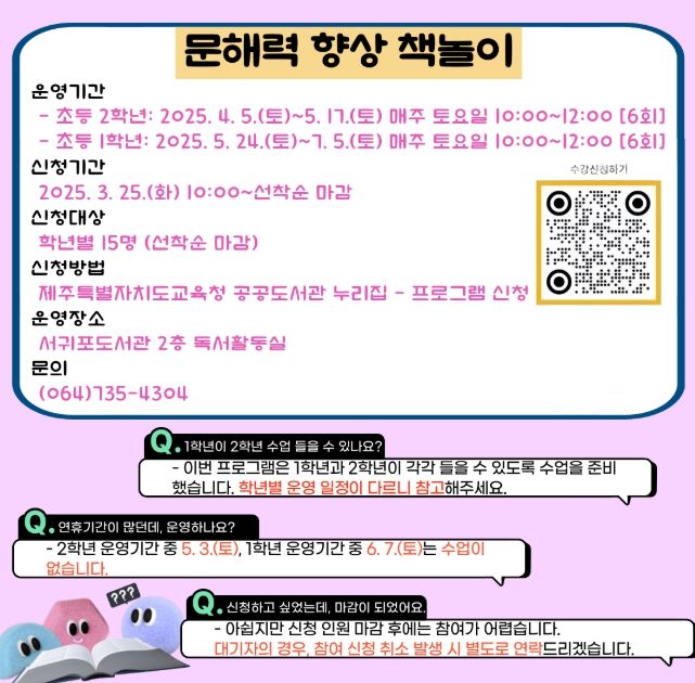 (아름다운교육신문) 제주도교육청 서귀포도서관은 24일 4월부터 오는 5월까지 아이들에게 독서의 즐거움을 알려주고 문해력을 높이는 데 도움을 주고자 문해력 향상 프로그램을 운영한다.
