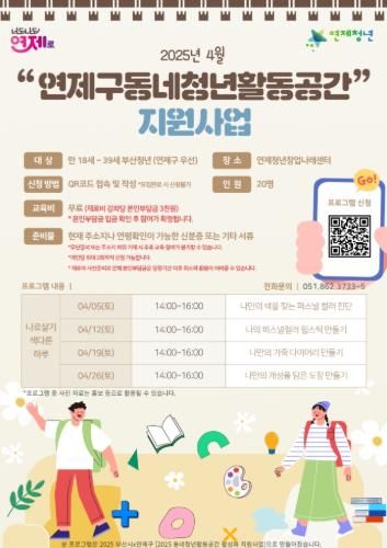 (아름다운교육신문) 연제구는 4월 5일부터 연제청년창업나래센터에서 ‘2025년 동네 청년활동공간 지원사업’ 프로그램을 운영한다.