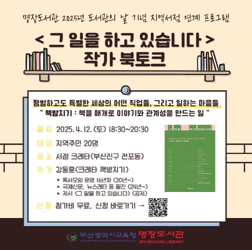 (아름다운교육신문) 부산광역시립명장도서관(관장 김정남)은 오는 4월 12일 오후 6시 30분부터 전포동 크레타 서점에서 지역주민 20명을 대상으로 ‘그 일을 하고 있습니다’ 작가 북토크를 실시한다.