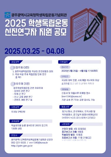 광주학생독립운동기념회관은 오는 25일부터 4월 8일까지 ‘학생독립운동 신진연구 지원 사업’ 참여자를 공모한다.