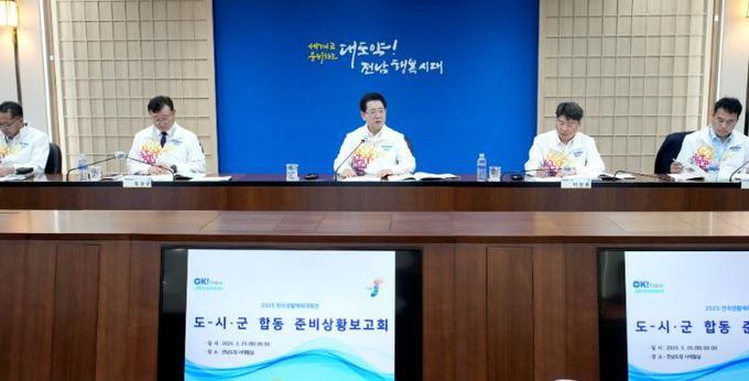 전남도는 25일 도청 서재필실에서 김영록 도지사 주재로 전남도교육청, 전남도경찰청, 전남도체육회, 12개 시군 관계자 등 40여 명이 참석한 가운데 2025 전국생활체육대축전 도-시군 합동 준비상황보고회를 개최했다.