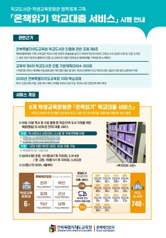 (아름다운교육신문) 전북특별자치도교육청은 책 읽는 학교 문화 조성을 위해 학교도서관과 학생교육문화관 간 협력체계를 구축하고, ‘온책읽기 학교대출 서비스’를 26일 전면 시행한다고 25일 밝혔다.
