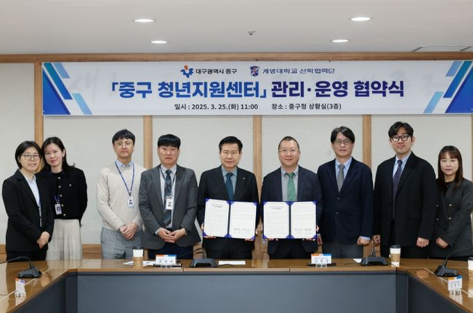 (아름다운교육신문) 대구 중구는 25일 구청 상황실에서 계명대학교 산학협력단과 ‘중구 청년지원센터’ 위‧수탁 협약식을 개최했다.