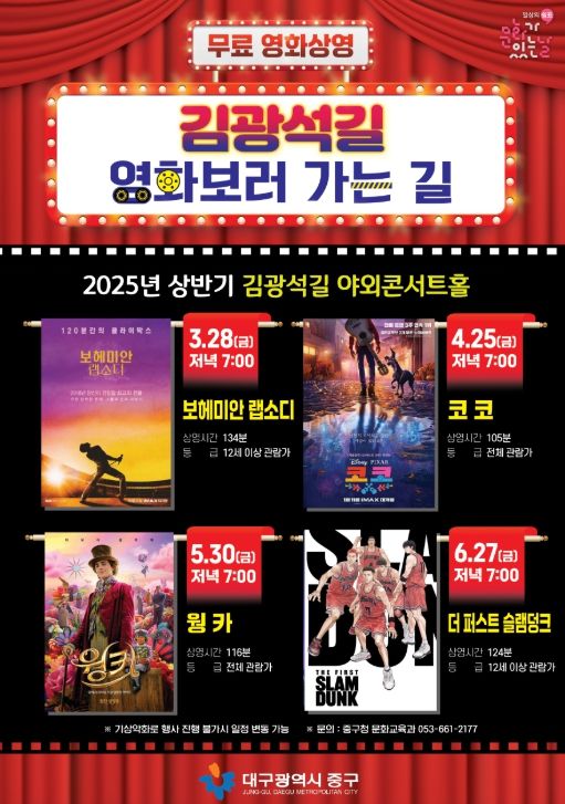 (아름다운교육신문) 대구 중구는 3월부터 10월까지 매월 마지막 주 금요일 저녁 7시, 김광석길 야외콘서트홀에서 ‘김광석길 영화관’을 운영한다.