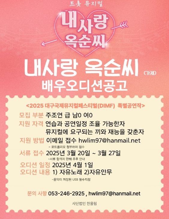 ‘내사랑 옥순씨’의 출연 배우 오디션은 3월 27일까지 서류 접수를 받고 4월 1일 대명공연거리 한울림 소극장에서 개최될 예정이다.