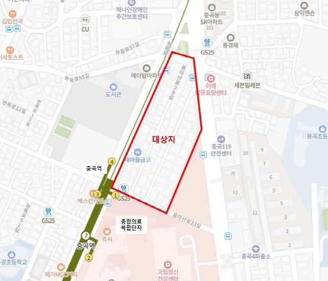 2022년 1월 국토교통부의 ‘8차 선도 사업 후보지’로 선정된 바 있는 중곡동 29번지 일대는 이번 도심공공주택 사업 추진으로 기존 ‘제2종일반주거지역’에서 ‘준주거지역’으로 용도지역이 상향될 예정이다.