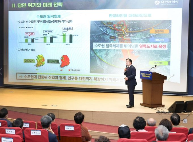이장우 시장은 발표 서두에서 대전과 충남이 걸어온 역사와 도시 성장의 흐름을 짚었다. “대전은 한 세기 전 행정의 중심지로 충남도청이 이전해 오면서 발전의 전기를 맞이했고, 이후 철도와 고속도로, 대덕연구단지를 통해 대한민국 과학 수도로 성장해 왔다”라며 “그러나 수도권 집중과 지방 소멸이라는 현실 앞에서 대전과 충남 모두 더 이상 분절된 체계로는 생존과 도약을 기대하기 어렵다”라고 진단했다.