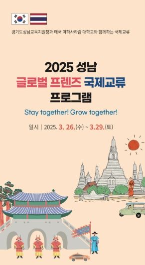 (아름다운교육신문) 경기도성남교육지원청은 태국 학생들과 교사 총28명을 초청하여 3월 26일부터 3월 29일까지 '2025 성남 글로벌 프렌즈'프로그램을 추진할 예정이다. 해당 학생들은 태국 마하사라캄 대학의 부설학교 소속 학생으로 지속가능한 성남지역 국제교류 활성화를 위해 성남교육지원청과 해당 대학은 26일 협력의향서(LOI)를 체결할 예정이다.