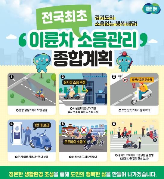 이 밖에도 소음 피해 사전 예방을 위해 전기 이륜자동차를 5년간 1만 대 보급, 주거지역과 병원 주변 등을 고려한 이동소음 규제지역 확대, 배달앱 플랫폼과 협력해 불법 개조한 이륜자동차의 배달 앱 사용 제한 등의 내용을 담았다.