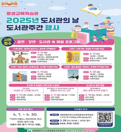 (아름다운교육신문) 세종특별자치시교육청평생교육학습관에서는 2025년 4월 12일 도서관의 날을 맞이하여 도서관 주간(4월 12일 ~ 18일) 행사를 개최한다.