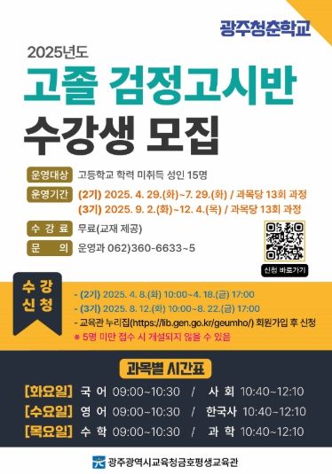 (아름다운교육신문) 광주시교육청금호평생교육관은 오는 4월부터 7월까지 운영하는 ‘2기 고졸 검정고시반’ 수강생을 선착순 모집한다.