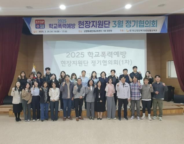 (아름다운교육신문) 경기도고양교육지원청은 3월 26일 고양미래인재교육센터 대강당에서 『2025 학교폭력예방 현장지원단 운영 협의회』를 개최했다. 이날 교원, 경찰관, 시청 관계자 등으로 구성한 30명의 현장지원단에게 위촉장을 수여하고, 올해 학교폭력예방 학교 지원 방안에 대해 협의를 실시했다.