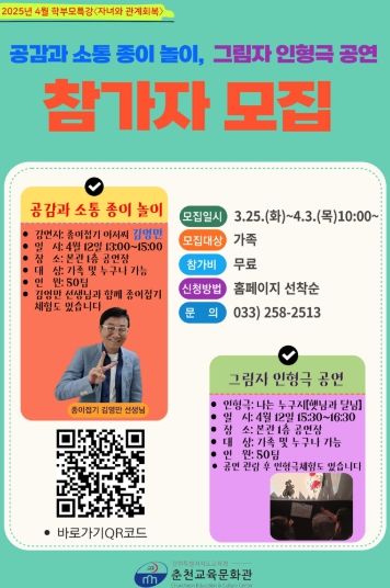 4월에는 김영만 강사의 ‘부모와 아이의 공감 소통 종이 놀이’와 우현순 강사의 ‘그림자 인형극 공연 및 체험’, 5월에는 이명렬 강사의 ‘비폭력의 시작 바른 인성’을 주제로 자녀와 동반하는 가족 50팀을 대상으로 춘천교육문화관 1층 공연장에서 운영한다.