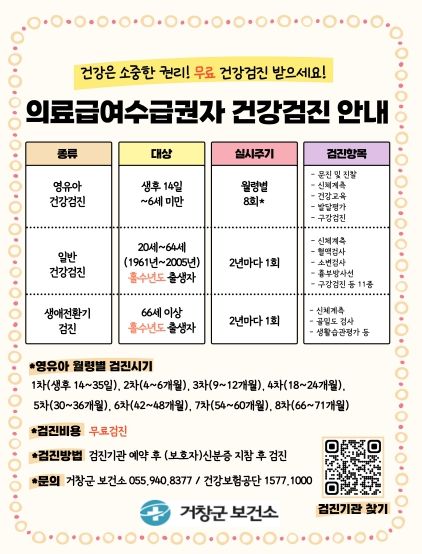 (아름다운교육신문) 거창군은 의료급여수급권자의 건강증진과 질병 예방을 위해 2025년도 건강검진 비용을 연중 지원한다고 밝혔다.