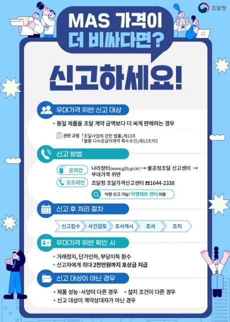 (아름다운교육신문) 조달청은 나라장터 종합쇼핑몰에 등록된 ‘다수공급자계약’ 물품에 대한 우대가격 유지 의무 위반행위 적발을 확대하기 위해 신고센터 신고 활성화를 추진한다.