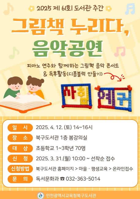 (아름다운교육신문) 인천광역시교육청북구도서관은 도서관의 날을 맞아 4월 12일 오후 2시부터 4시까지 1층 봄강의실에서 ‘그림책 누리다, 음악공연’을 개최한다.