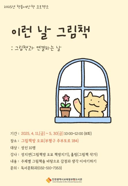 (아름다운교육신문) 인천광역시교육청부평도서관은 28일부터 지역사회 독서 문화공간과 함께하는 ‘책동네산책’ 프로젝트, ‘이런 날 그림책: 그림책과 연결하는 날’ 참가자를 모집한다.