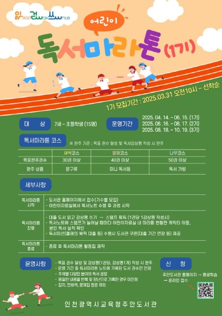 (아름다운교육신문) 인천광역시교육청주안도서관은 어린이 독서 습관을 기르기 위해 독서 활동을 마라톤에 접목한 ‘읽걷쓰 어린이 독서마라톤(1기)’참여자 15명을 선착순 모집한다.