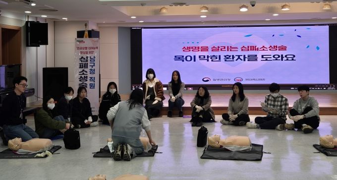 (아름다운교육신문) 대구 남구는 지역 내 응급상황 발생 시 신속한 대처를 위해 남구청동 행정복지센터남구보건소 등 전 직원 대상 심폐소생술 등 응급처치 교육을 3년 연속으로 실시하고 있다.