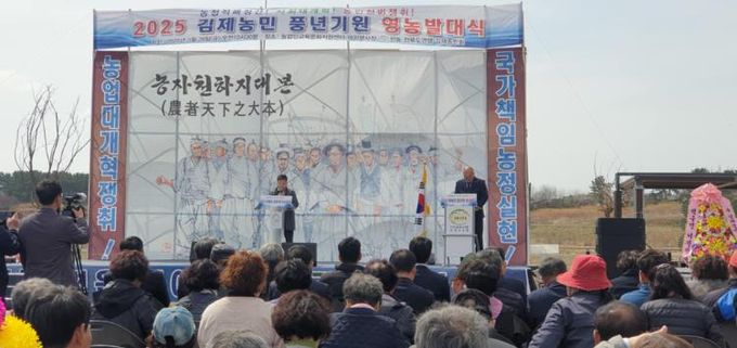 김제농민회와 여성농민회가 마련한 이날 영농발대식은지역 농민, 그리고 정성주 김제시장과 서백현 시의장을 비롯한 시의원, 지역 기관 단체장 등 200여 명이 참석했다.