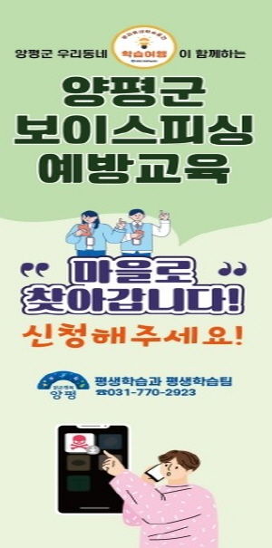 (아름다운교육신문) 양평군은 농한기를 맞아 어르신들의 보이스피싱 피해 우려가 커짐에 따라 주민 보호 대책의 일환으로 ‘찾아가는 보이스피싱 예방교육’을 실시했다고 27일 밝혔다. 이는 전진선 양평군수가 지역 사회 안전 강화를 위해 직접 관심을 갖고 지원한 사업이다.